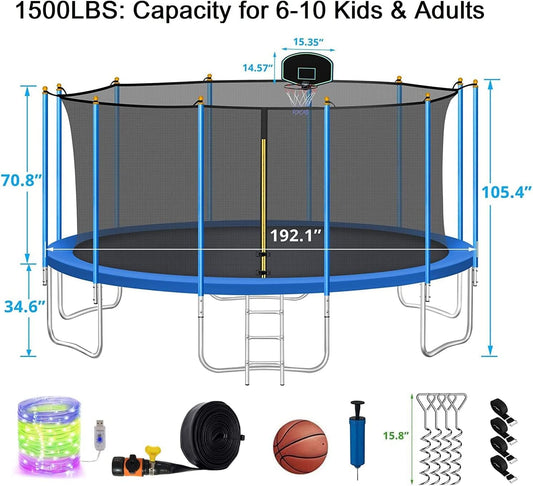 1500LBS 16 FT Tranpoline for Adults Kids, Tranpoline with Lights, Sprinkler, Socks, Enclosure Net, Basketball Hoo, 4 Anchors & Ladder, Heavy-Duty Outdoor Backyard TranpolineRegular price $748.71 USDRegular priceUnit price / per$0.00 USDSale price $748.71 USDSold out